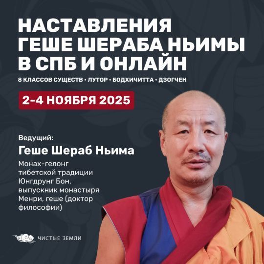 Со 2 по 4 ноября 2025 года в Санкт-Петербурге очно и онлайн Геше Шераб Ньима даст наставления по развитию бодхичитты, традиционным представлениям о восьми классах существ и особенностям практики Дзогчен.