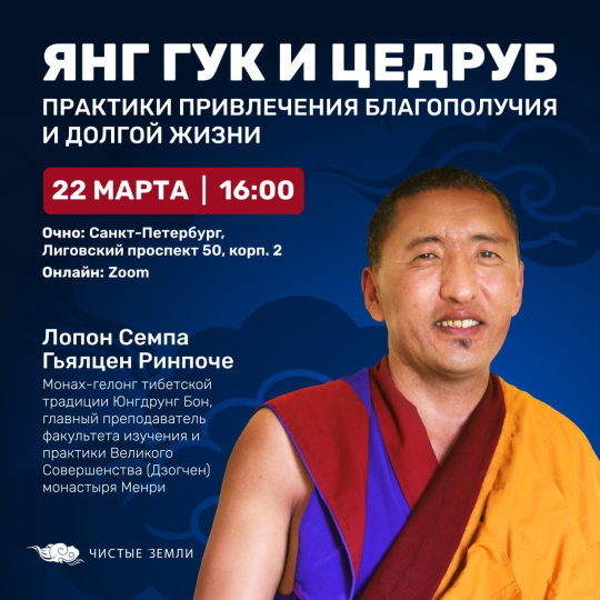 22 марта Лопон Семпа Гьялцен Ринпоче познакомит всех желающих с практиками привлечения благополучия и долгой жизни в Санкт-Петербурге и онлайн