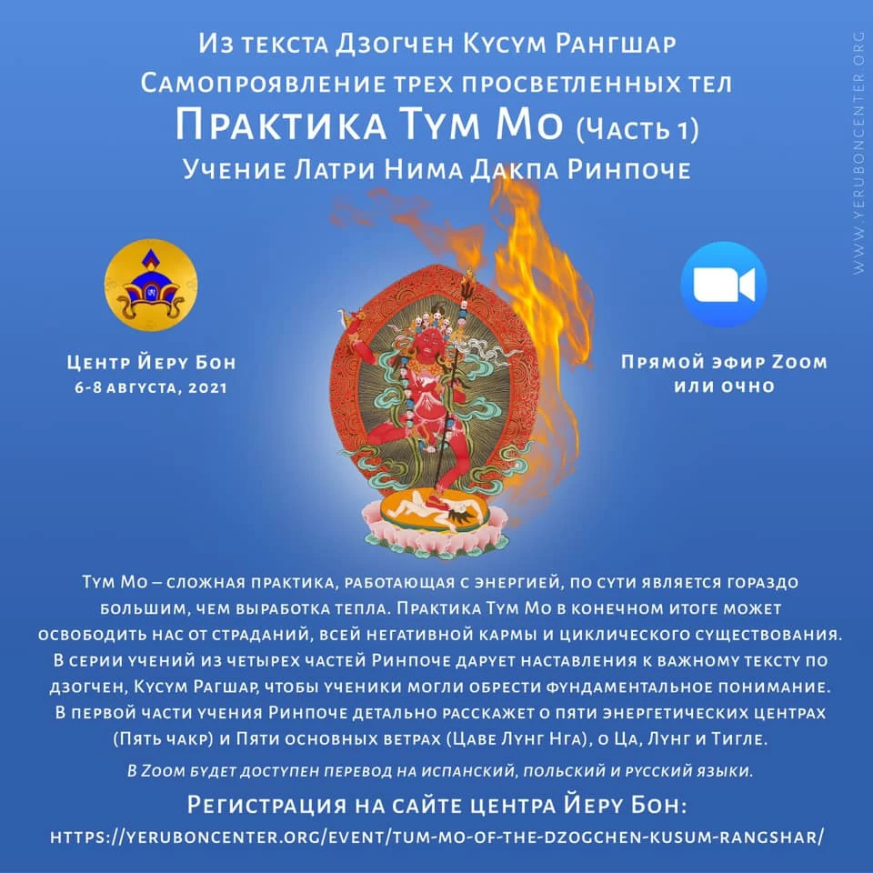 6-8 августа 2021 Латри Нима Дакпа Ринпоче проведет первую часть учений по практике Туммо по тексту Кусум Рангшар.