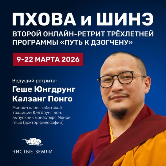 С 9 по 22 марта 2026 года Геше Юнгдрунг Калзанг Понго Ринпоче проведёт онлайн-ретрит по практикам Пхова и Шинэ в рамках трёхлетней программы «Путь к Дзогчену».